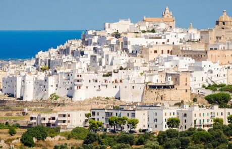 Ostuni, la Città Bianca, Białe Miasto Apulii, które majestatycznie wznosi się na wzgórzu na wysokości 218 m n.p.m. Wymuskaną bielą wyraźnie odcina się od błękitu morza i nieba. Czas płynie tu inaczej, zwalnia. I ty też zwalniasz. Zbyt pochłaniają cię turkusowe okiennice, różowe bugenwille, zielone drzwi, złoto zachodzącego słońca. Przysiadasz na schodach i słuchasz szeptów murów, pomruków uciekających jaszczurek, kwiatowych dzwonków.