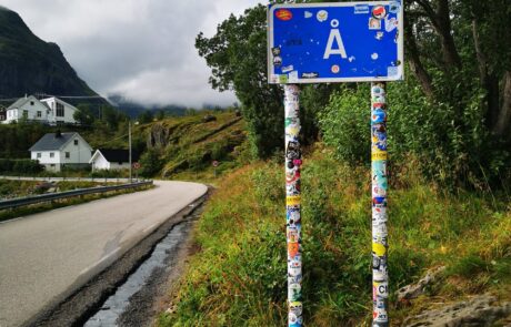 W nagrodę za zdobycie szczytu, pojedziemy jeszcze do Å – koniec świata. Miasteczko słynie przede wszystkim ze swojej krótkiej nazwy. Jest to ostatnia miejscowość do której można wjechać samochodem na Lofotach. Tu kończy się droga, to taki lokalny koniec świata. Jest osada domków rorbu, niewielkie muzeum, restauracja, sklep z pamiątkami oraz króciutki szlak na klif, będący zakończeniem Lofotów. Głównym powodem dla którego wszyscy przyjeżdżają jest zrobienie zdjęcia z drogowskazem na początku miejscowości.